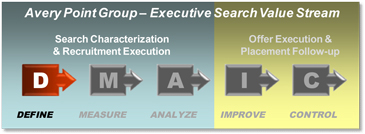 Our Lean Sigma Approach Search excellence starts with the sound foundation of a well defined and consistent search methodology. Our Lean Sigma Search™ process incorporates a unique Lean Six Sigma approach to filling our clients’ staffing needs. Each phase of our executive search value stream process is designed to eliminate waste in order to move the search and recruiting process along efficiently and effectively, thus enabling us to exceed our clients’ expectations and requirements.