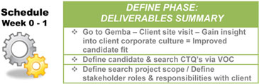 Just as with any customer-centric Lean Six Sigma value stream process, in order to provide quality service, the Define phase of our Lean Sigma Search™ methodology starts with the voice of the client (VOC). This is the first important step in our process toward clearly defining the client’s critical to quality (CTQ) search requirements and sets the stage for the rest of the executive search value stream process.